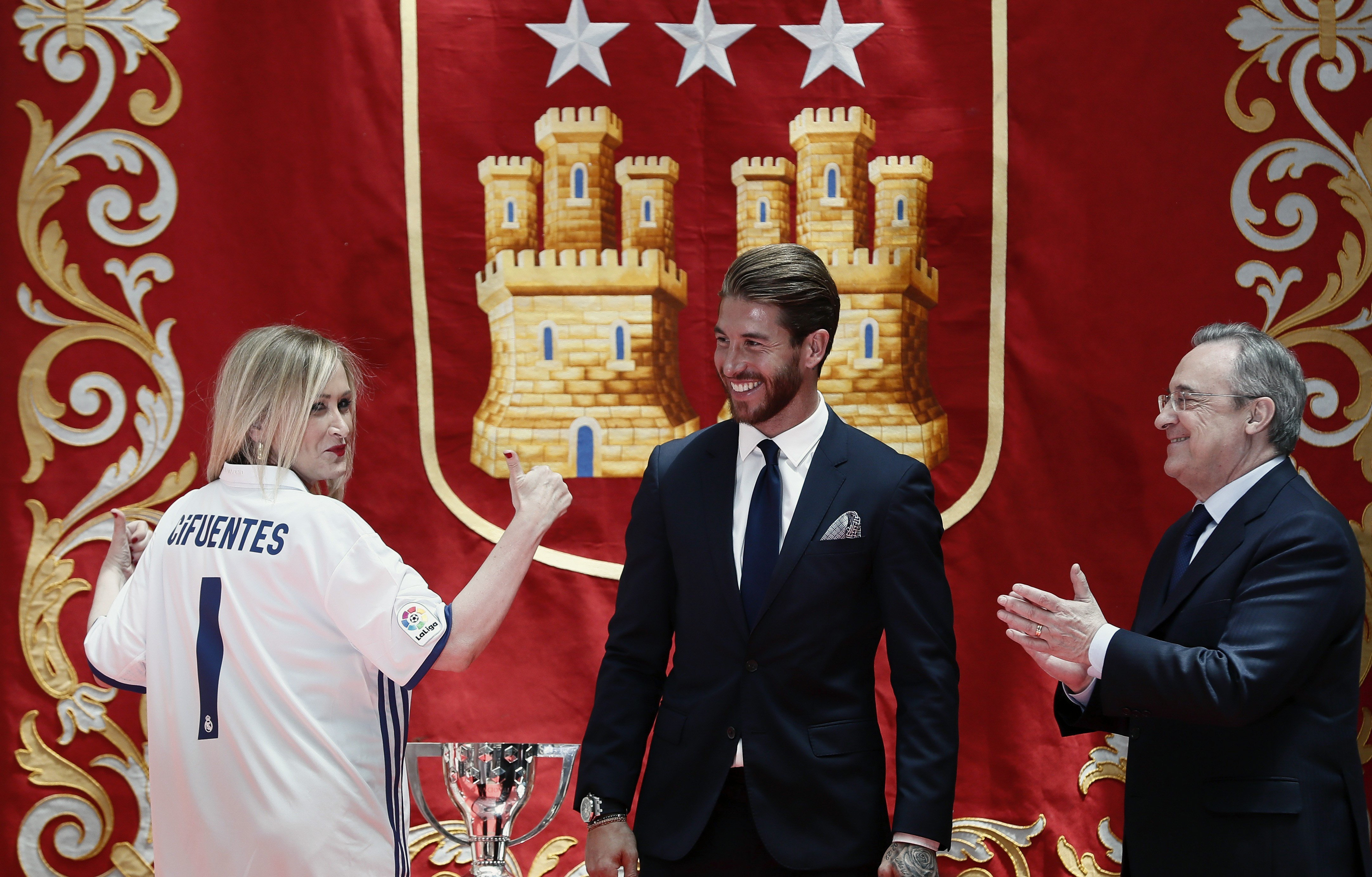 Cristina Cifuentes, reconocida seguidora madridista, junto a Sergio Ramos y el presidente del club, Florentino Pérez.
