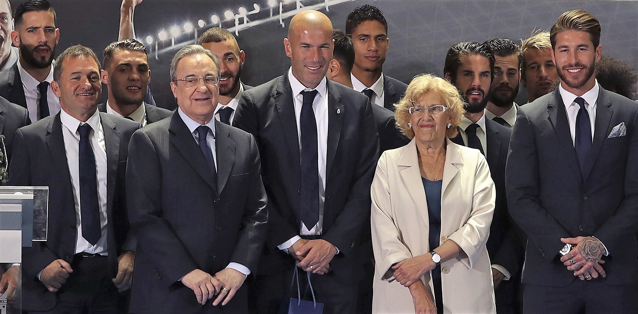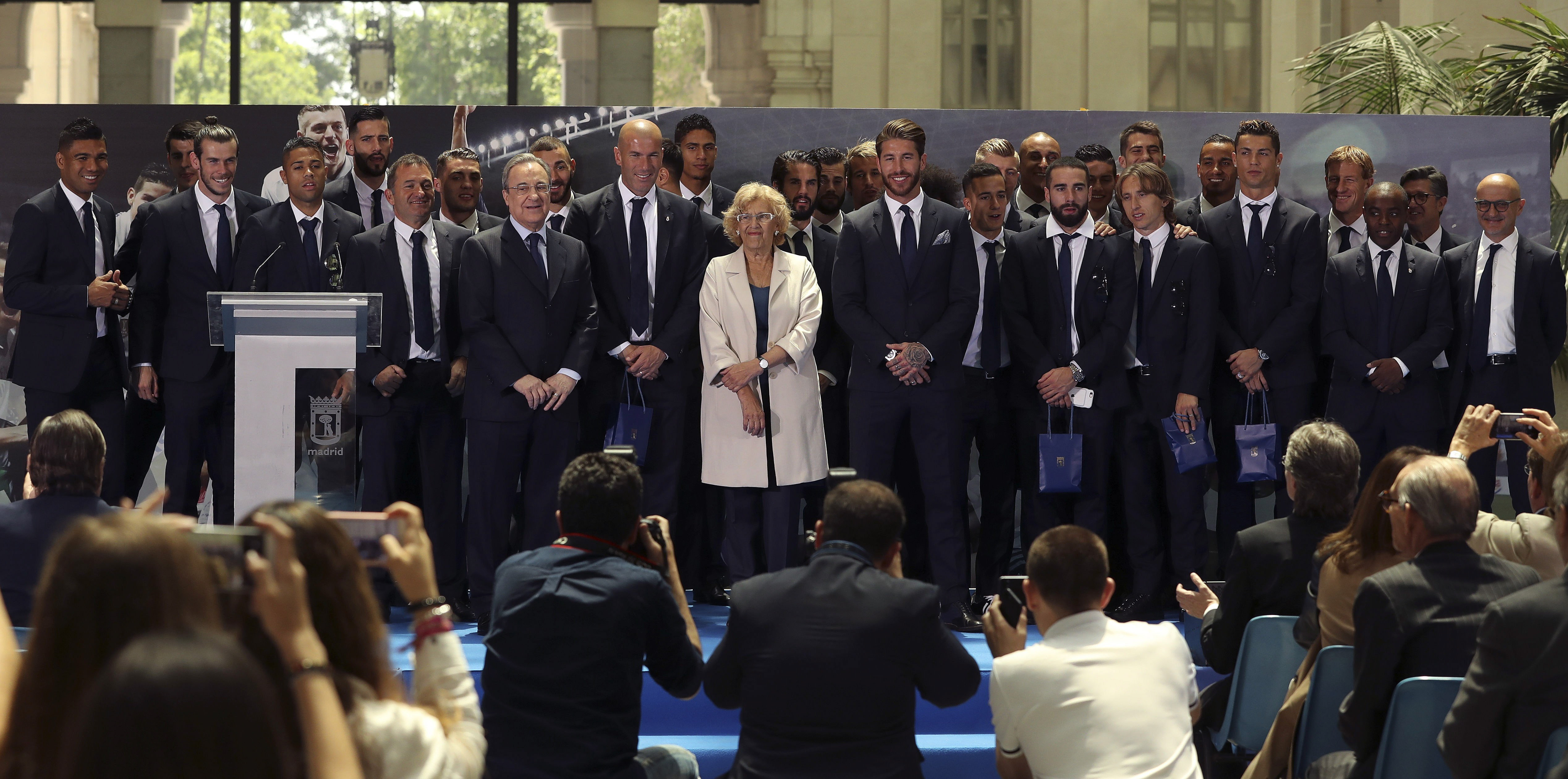 Manuela Carmena posa junto a los jugadores del Real Madrid, el técnico Zinedine Zidane y el presidente Florentino Pérez.
