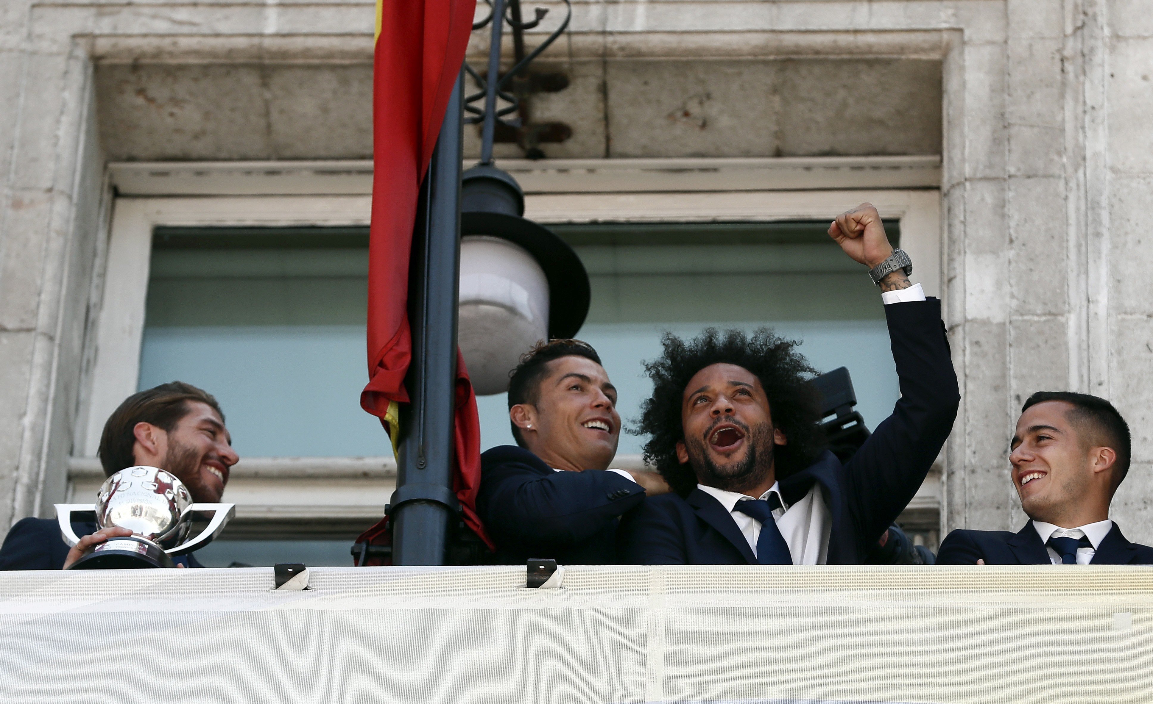 Los cuatro jugadores madridistas, eufóricos en el balcón de la Real Casa de Correos por la conquista del título de Liga.