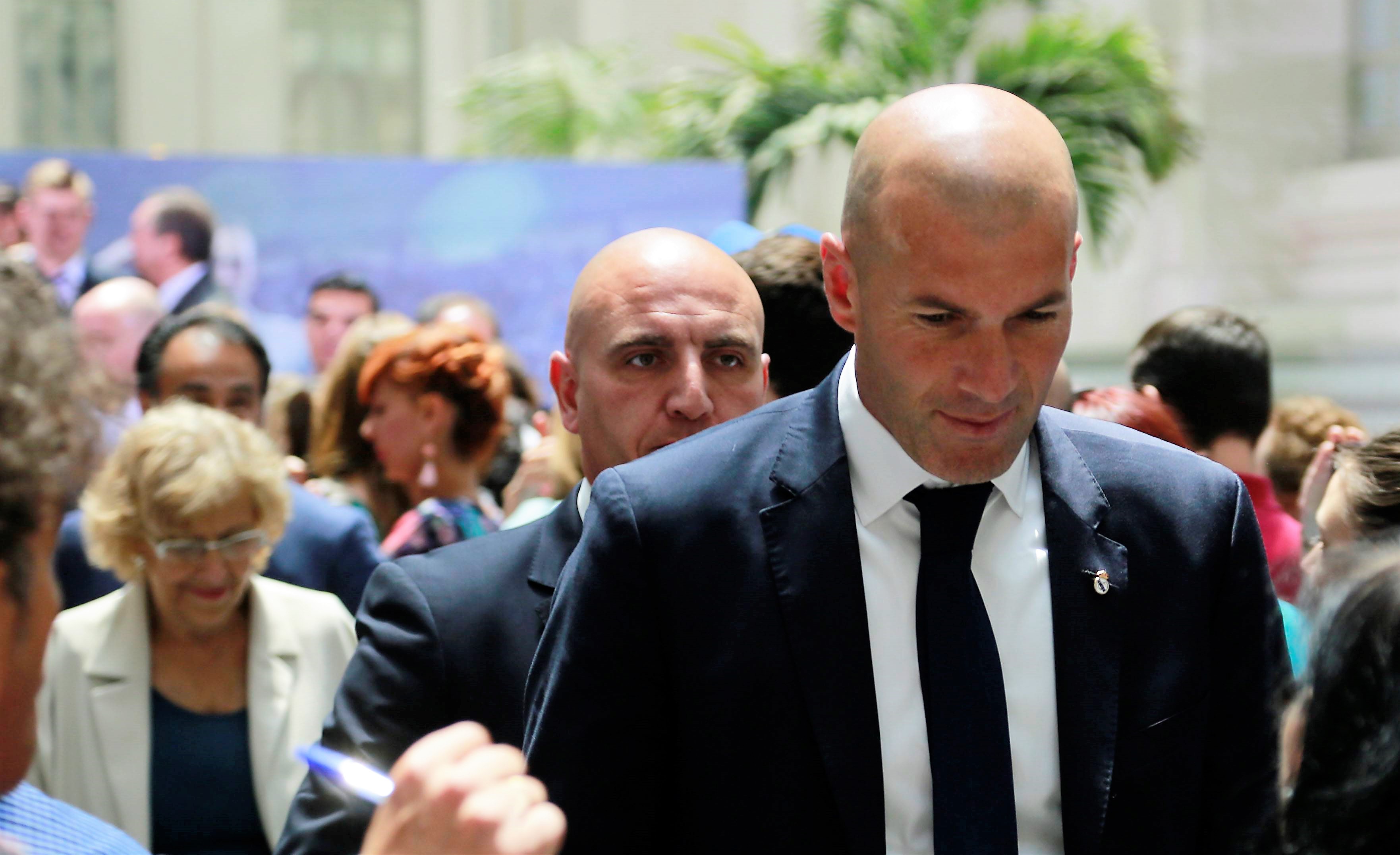 Zinedine Zidane, en primer plano en la recepción ofrecida al Real Madrid en el Palacio de Comunicaciones, sede del Ayuntamiento de la capital. Al fondo, la alcaldesa Manuela Carmena.