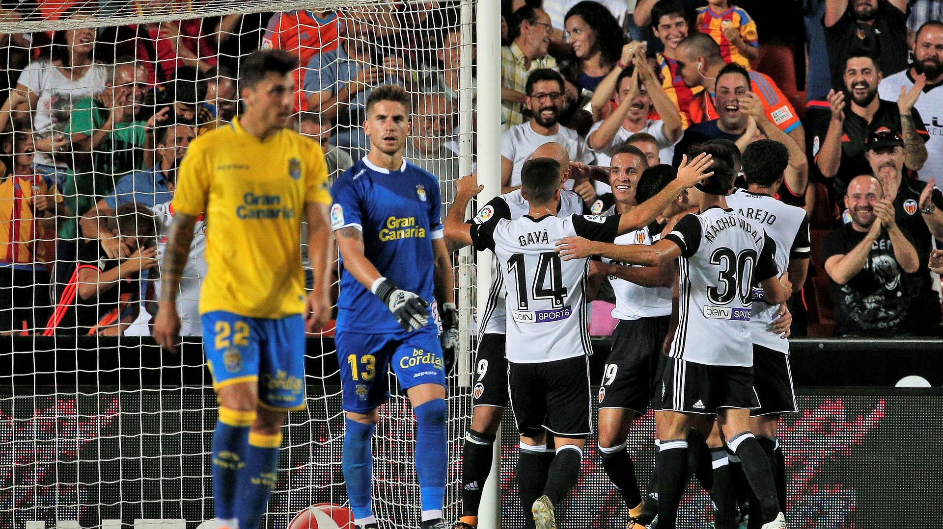 Tras diez minutos iniciales de tanteo, fue el Valencia el que comenzó a prodigarse con más peligro en el área rival. Zaza tuvo la primera gran ocasión, tras recuperar un balón en el área, pero el meta Chichiloza le ganó la partido en el mano a mano. El meta del conjunto canario se lució de nuevo en una internada del joven lateral Nacho Vidal, aunque en el ecuador del primer acto no llegó al colocado disparo raso desde la frontal de Zaza, tras una gran acción de Carlos Soler, que supuso el 1-0.