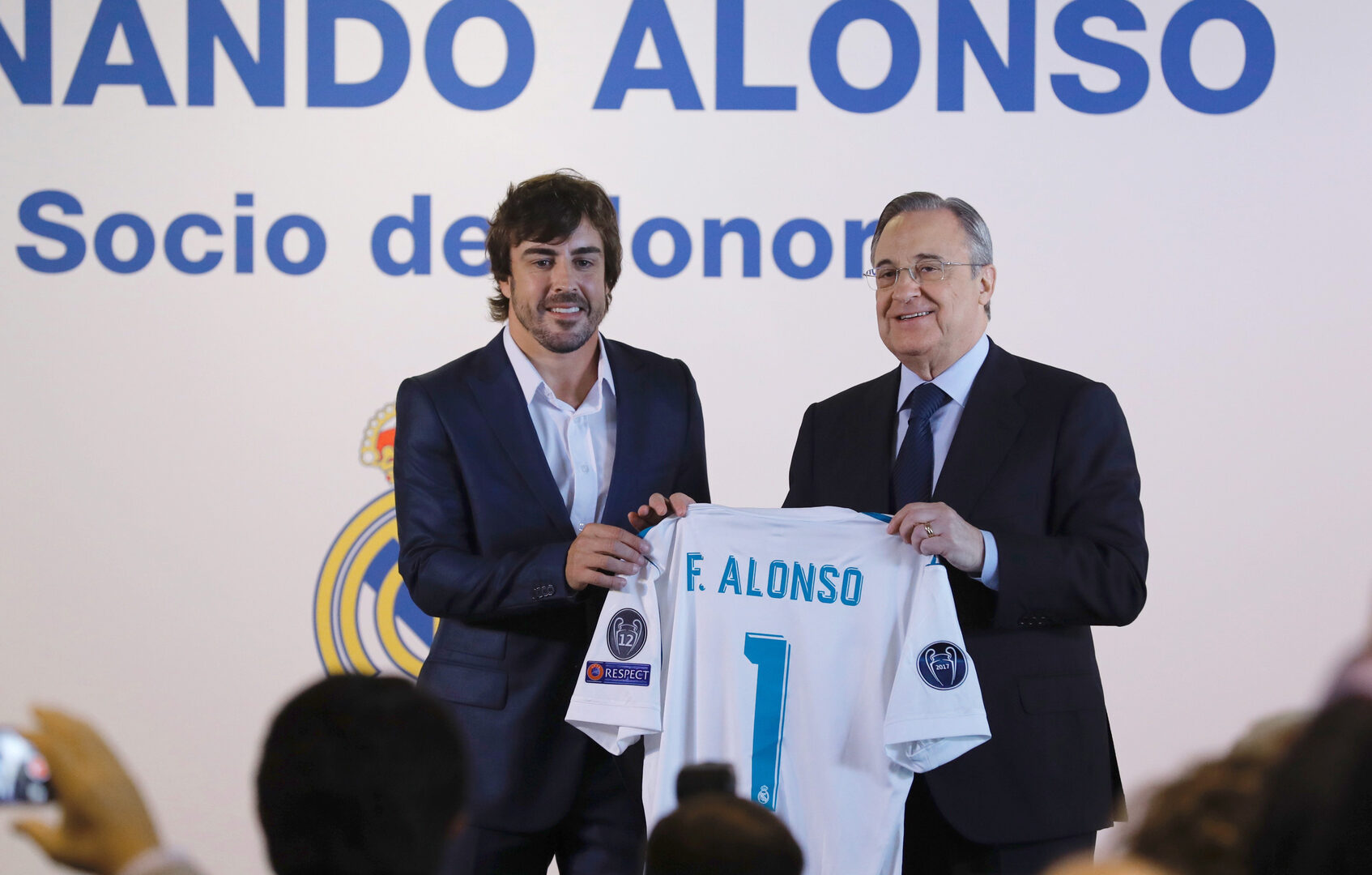El piloto asturiano Fernando Alonso, doble campeón del mundo de Fórmula Uno en 2005 y 2006, recibió este lunes el reconocimiento del Real Madrid al entrar en el selecto grupo de socios de honor del club, cuyo presidente, Florentino Pérez, le obsequió con una camiseta con el número uno.