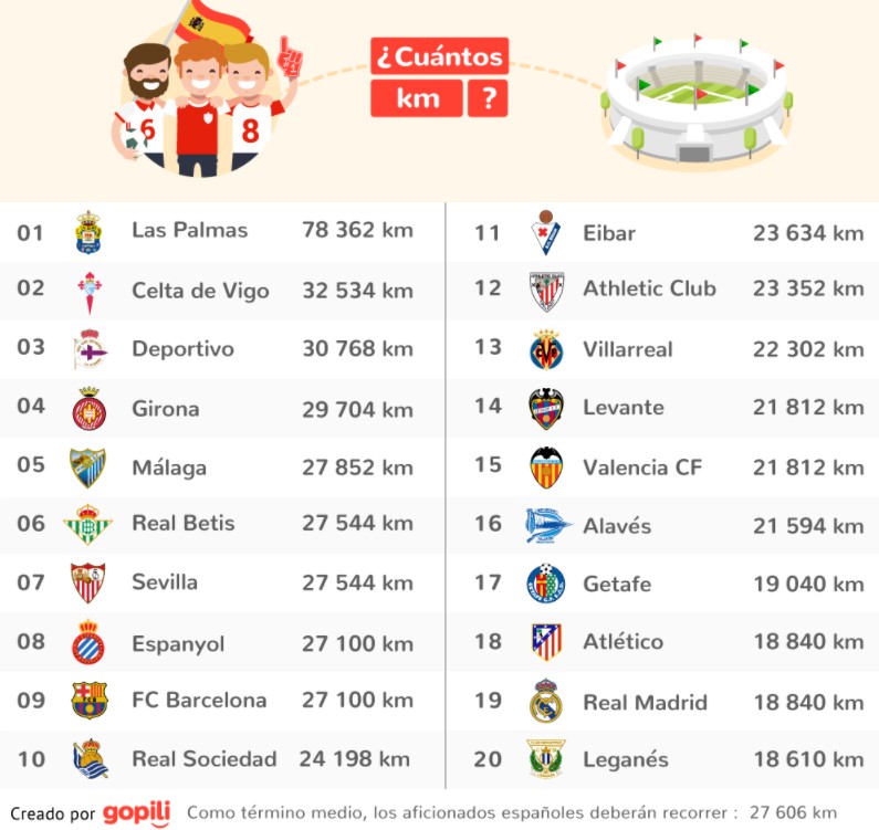 La aplicación GoPili, un buscador de billetes, ha sacado a la luz una peculiar lista en la que calcula los kilómetros que cada equipo de Primera División recorrerá esta temporada para visitar a los 19 rivales de La Liga.