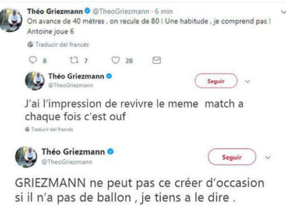 "Avanzamos 40 metros, retrocedemos 80. Algo habitual, no lo comprendo. Antoine juega de 6". "Tengo la impresión de revivir el mismo partido", escribió en la segunda publicación, tras haber borrado el primer tuit. Después se centró en la figura de su hermano : "Griezmann no puede crear una ocasión si no tiene el balón, lo tenía que decir", volvió a quejarse.