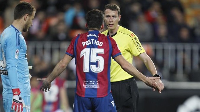 El Levante está que trina con el arbitraje del catalán Medié Jiménez, anoche en el derbi contra el Valencia en Mestalla (3-1). El colegiado de Sabadell, debutante en Primera División, la lió en el estadio valencianista con un gol mal anulado al conjunto granota y al inventarse un penalti a favor de los locales por un inexistente derribo a Zaza.