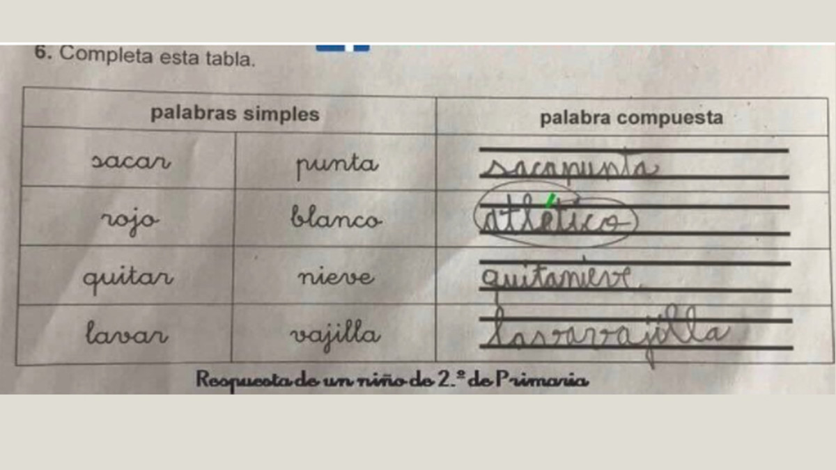 En un ejercicio para componer una palabra compuesta con las palabras simples "rojo" y "blanco" el alumno de segundo de Primaria contestó: "Atlético (de Madrid)".