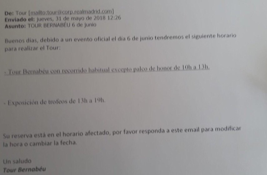 El Real Madrid ha mandado un correo en el que avisa que el día 6 de junio tiene programado un evento oficial por el que cambia el horario habitual del Tour del Santiago Bernabéu. El palco de honor, donde se realizan, entre otros asuntos, las presentaciones, estará cerrado para las visitas del público desde las 10h hasta la 13h.