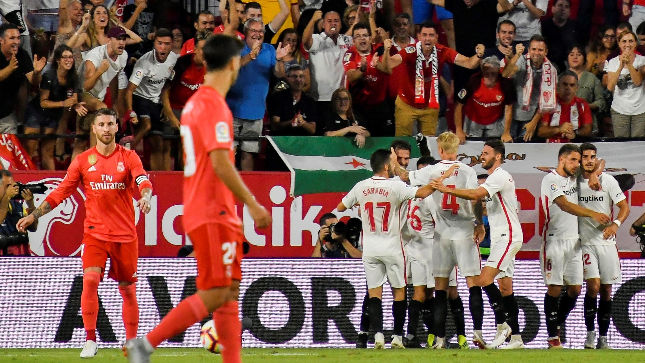 Desde el pitido inicial se vio lo que iba a ser el partido: una pesadilla para el Madrid. Y es que el Sevilla, que finalmente jugó con dos puntas –André Silva y Ben Yedder– tras las dudas surgidas en la víspera, fue un vendaval desde el comienzo, llegando con mucho peligro en los primeros compases. Sólo 15 segundos tardaron los andaluces en crear su primera ocasión clara, en las botas de Silva, aunque Courtois, el portero titular para la Liga, se lució con un paradón.
