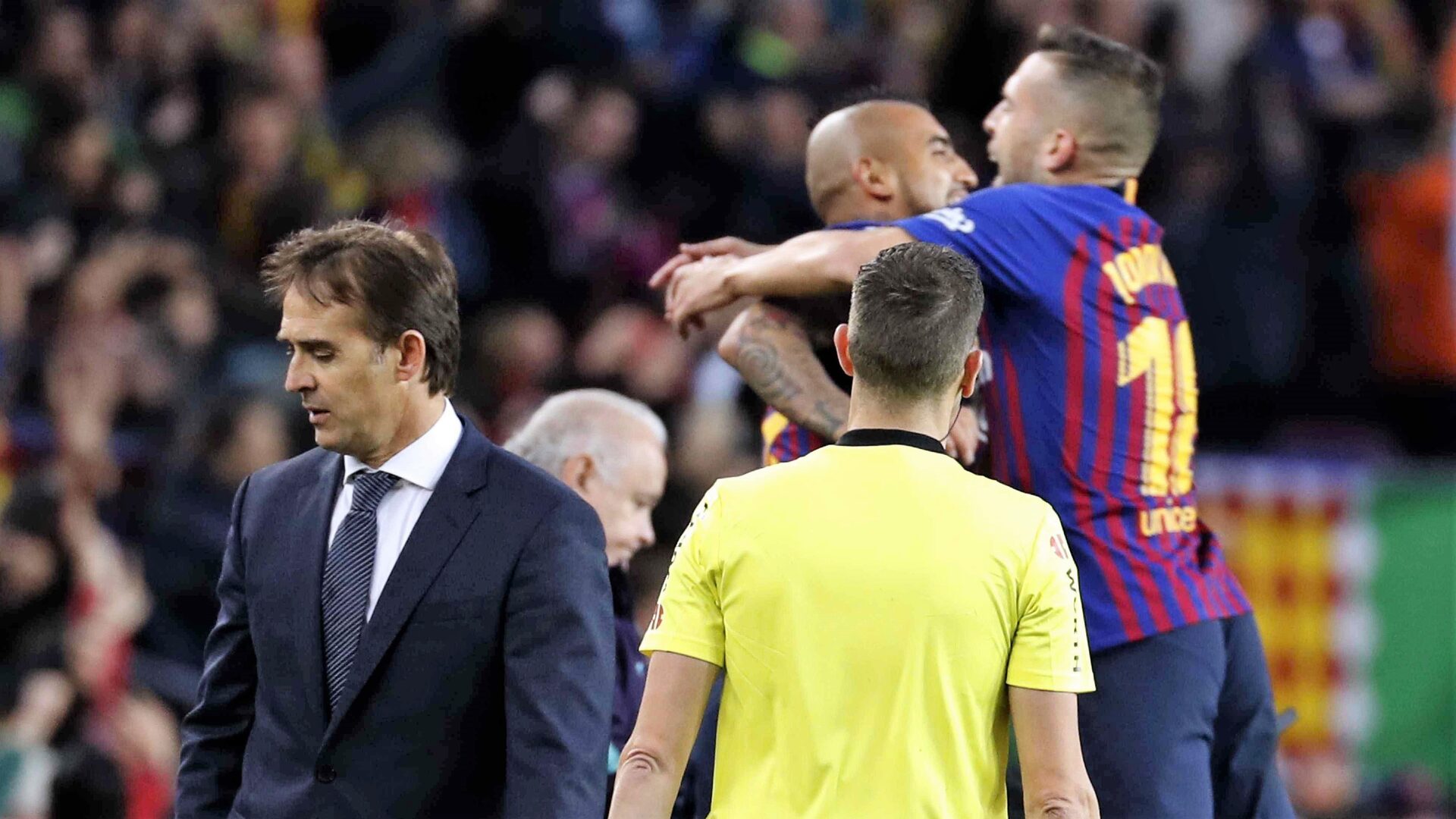 La debacle comenzó con otra decisión de Lopetegui. ¿Qué iba a hacer con el lateral derecho? Era la pregunta que nos hacíamos en la previa. Pues, por segundo partido consecutivo, optó por un jugador que no era Odriozola. Nos hemos acostumbrado a que Nacho cumpla de lateral pero no lo es. Y menos cuando no está en un buen momento, no recibe ayudas y tiene por delante al mejor lateral izquierdo del mundo. Nacho tenía que otorgar seguridad ante Jordi Alba y fue todo lo contrario. El canterano se vio desesperado pero, aunque su partido fue malo, estuvo a años luz del de Sergio Ramos y Varane. Los dos centrales están para jugar en el Castilla, volver a poner los pies en el suelo y ya de paso, aprender, otra vez, unas lecciones que han debido de olvidar. Ramos, por ejemplo, a no despejar hacia el centro del área o a intentar controlar con el pecho siendo el último defensa teniendo a dos rivales encima. Varane, por su parte, tendría que aprender a no meter una patada por detrás al delantero cuando estás dentro del área. Ejemplos que suman, suman y siguen sumando goles en contra. El primer tanto, fue de Coutinho pero el 95% fue de Jordi Alba. El segundo, el penalti absurdo de Varane.