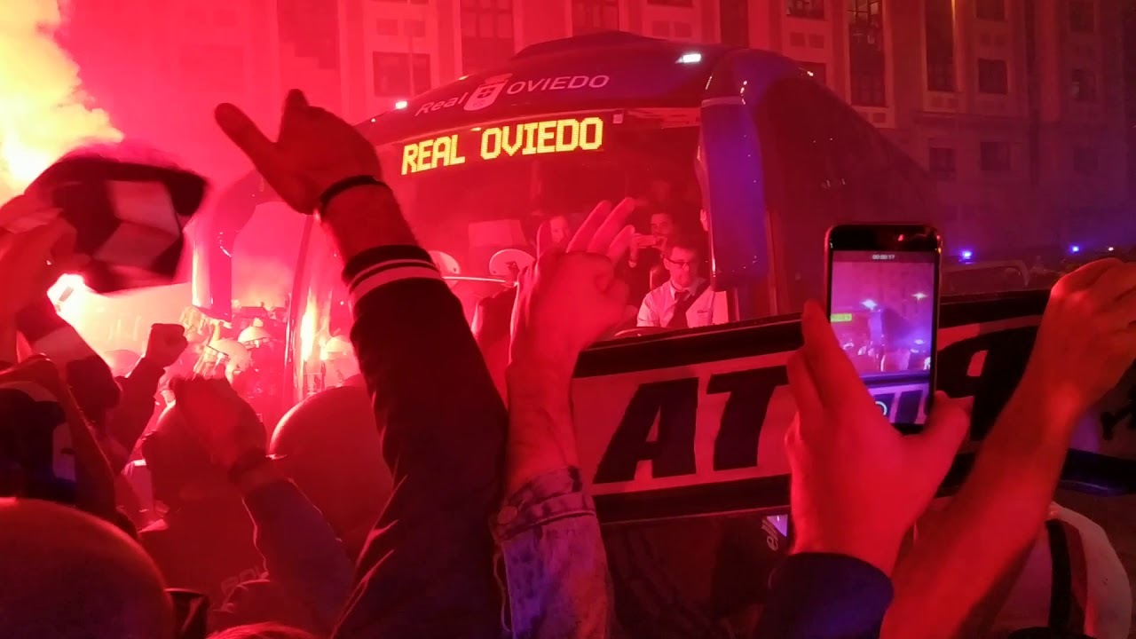 El espectacular recibimiento al Real Oviedo en el derbi asturiano