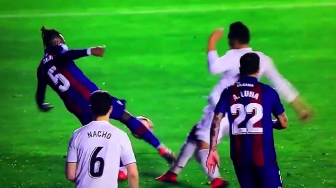 El Levante terminó el partido indignado con la actuación del colegio gallego que pitó dos penaltis a favor del Madrid. Uno bastante claro por una flagrante mano de Bardhi y el segundo, el que dio el triunfo al conjunto visitante, que deja muchas dudas. Casemiro cae dentro del área y da hasta cuatro vueltas de campana tras rozarle con su bota en el tobillo Doukouré.