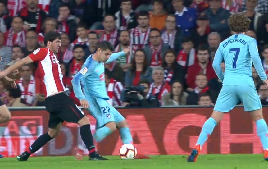 San José interfirió en el remate del delantero del Atlético de Madrid y Morata le dio una patada por detrás. El colegiado lo tuvo muy claro y el VAR le ratificó. Se reclamó otro sobre Griezmann.