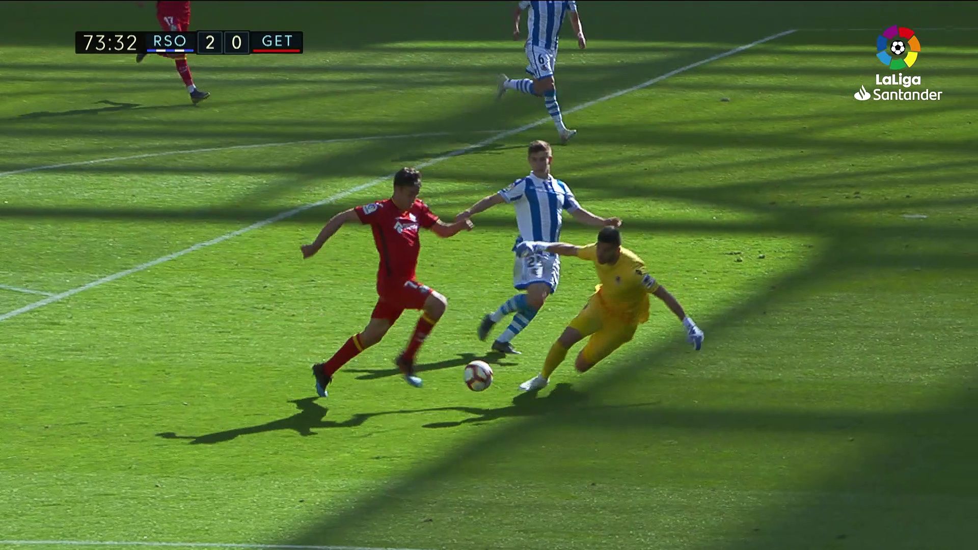 Fue la primera de las dos acciones comprometidas que se vieron hoy en el encuentro de Anoeta. La acción parece clara, pero el colegiado del encuentro, Prieto Iglesias, no lo consideró así.