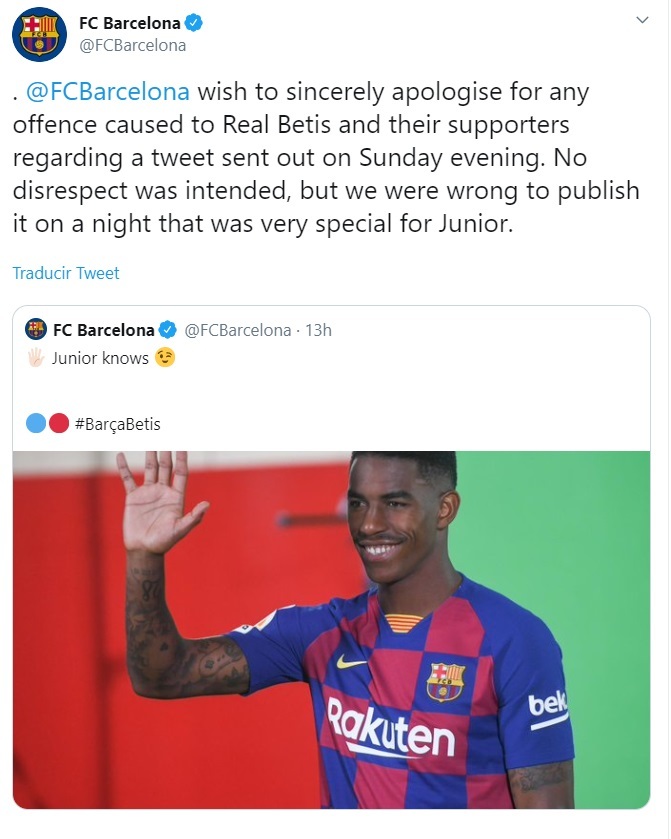 Fue tal el cabreo de la afición del Betis, que el Barcelona se vio obligado a pedir disculpas públicamente. "Pedimos sinceras disculpas por cualquier ofensa causada al Real Betis y sus aficionados por el tuit. No pretendíamos faltar al respeto, pero nos equivocamos al publicarlo en una noche que fue muy especial para Junior".