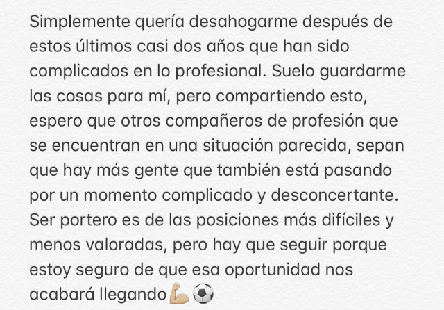 Tras salir del Celta B en 2017, equipo con el que llegó a disputar la fase de acenso a Segunda, fichó por el Badajoz, equipo que decidió rescindir su contrato en el mercado de invierno. Allá por enero de 2018. Ahí comenzó su calvario. Más de un año sin encontrar un equipo hasta que el pasado marzo se incorporó al Don Benito. Con el equipo extremeño disputó 6 encuentros, pero al final de la temporada decidió no seguir contando con sus servicios. Este verano tampoco encontró equipo. Totalmente hundido, este martes decidió abrir su corazón al mundo y mostrar sus sentimientos: