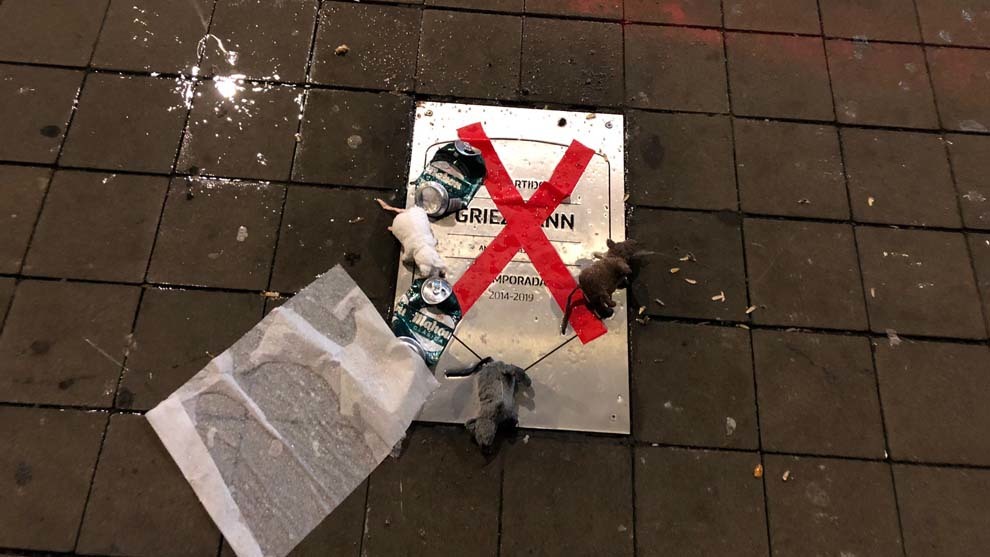 Un grupo de aficionados del Atlético de Madrid dejó basura y varias ratas de peluche sobre la placa que recuerda las cinco temporadas como rojiblanco del delantero francés Antoine Griezmann en los aledaños del estadio Wanda Metropolitano, a una hora del comienzo del duelo entre el equipo madrileño y el Barcelona.