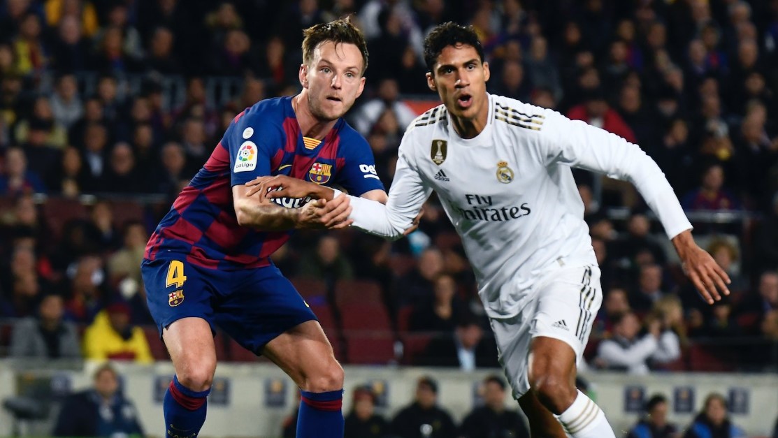 Lenglet clava los tacos en el muslo de Varane dentro del área. Inexplicable penalti que se come el VAR en Camp Nou. href="https://t.co/rrITF56thx">pic.twitter.com/rrITF56thx