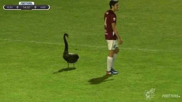 A pesar de los intentos de los jugadores y miembros de seguridad, la oca se negaba a abandonar el terreno de juego. La oca, poco a poco, ha salido por la banda del campo del Real Unión de Irún.
