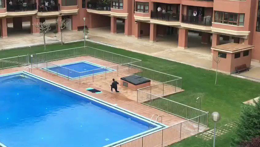 Juanjo Camacho es una leyenda en Huesca. Excapitán hasta la temporada pasada, es el jugador que más ha vestido la camiseta del conjunto oscense en toda su historia. Camacho, que recibió la idea de compartir su entrenamiento personal con sus vecinos a través de un grupo de WthasApp, se situó en la piscina de su urbanización y durante veinte minutos dirigió varios ejercicios mientras desde los balcones el resto de residentes recibían sus indicaciones.