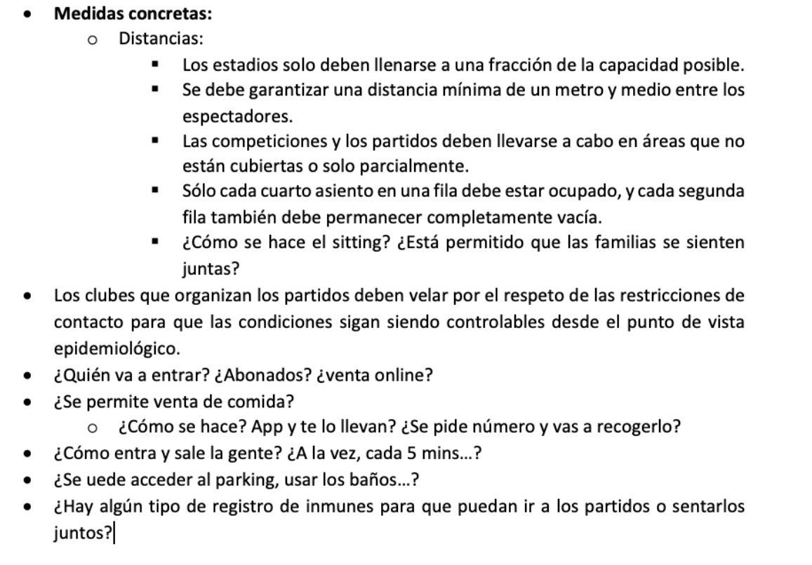 Asimismo, LaLiga se muestra preocupada por el tema de los abonos y la venta de entradas online, así como por el hecho de si se permite la venta de comida y bebidas en los recintos, además del uso de instalaciones como el parking o los baños y la forma en la que la gente entra y sale de los estadios.