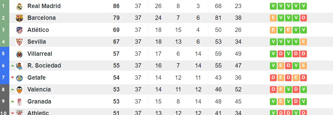 Solo el Villarreal, a pesar de su derrota en el estadio Alfredo Di Stefano ante el Real Madrid, tiene un puesto asegurado entre los siete primeros. Los de Calleja, uno de los mejores equipos tras la reanudación, se meten en Europa como justo premio a su buen juego. Las otras dos plazas de Europa League, sin embargo, aún están en el aire.