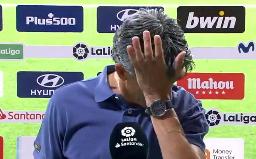 Imanol Alguacil, entrenador de Real Sociedad, se emociona durante la rueda de prensa tras el partido ante el Atlético de Madrid. Un duelo disputado y que se complicó tras el tanto de Koke a la media hora de la primera mitad. La Real Sociedad lo intentaba pero la defensa impuesta por los de Simeone les impedía poner en demasiados aprietos la portería de Oblak.
