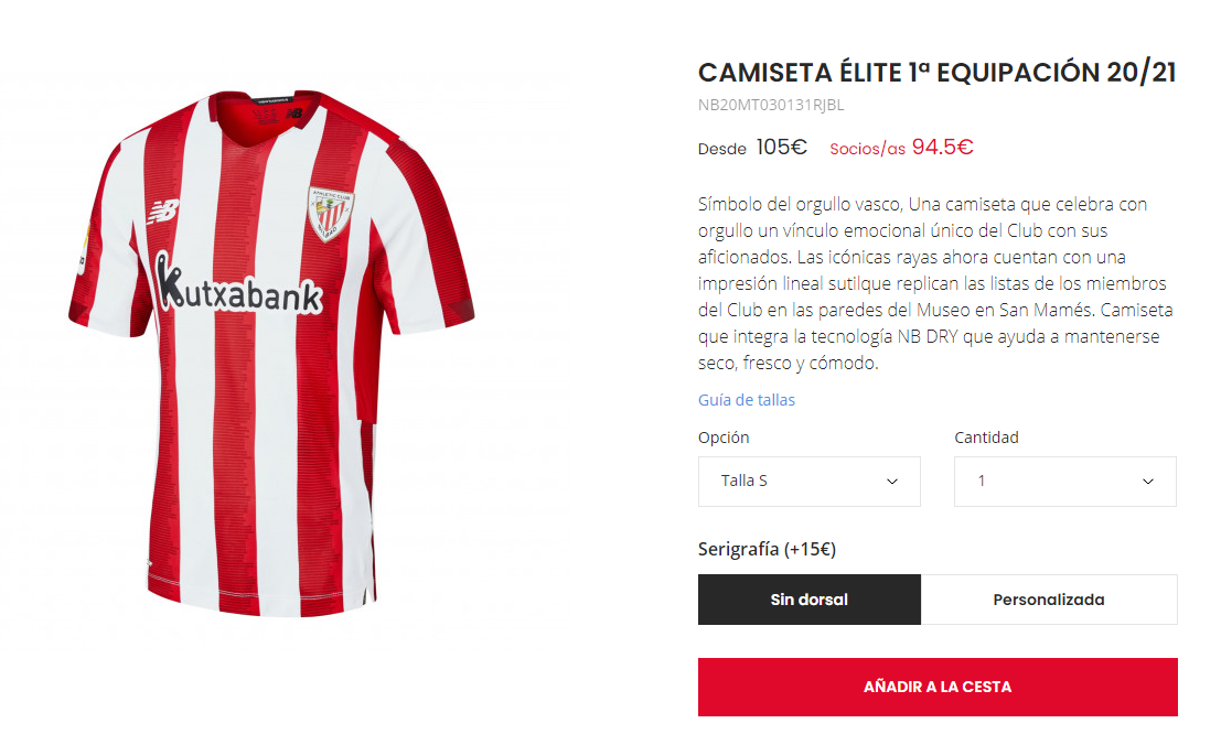 Camiseta original del Athletic por 105 € para los no socios. La seriegrafía son 15€ más