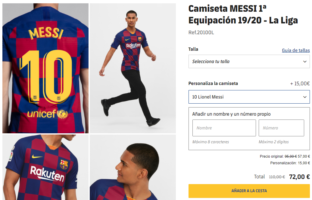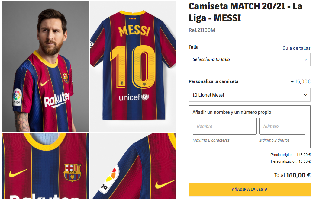Camiseta de competición del Barcelona, 145€. 15 euros más con seriegrafía llegando al coste de 160€
