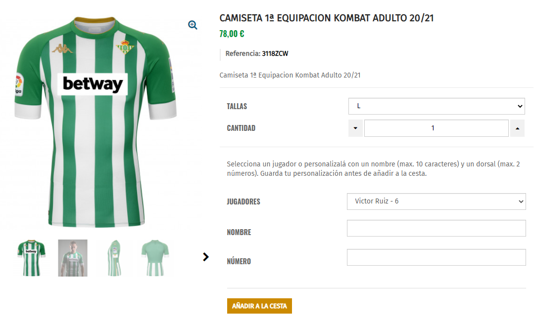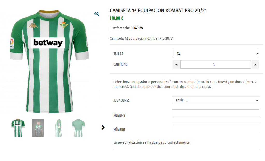 Camiseta oficial de competición del Betis 110 €. 15€ más si se le imprime nombre y dorsal.