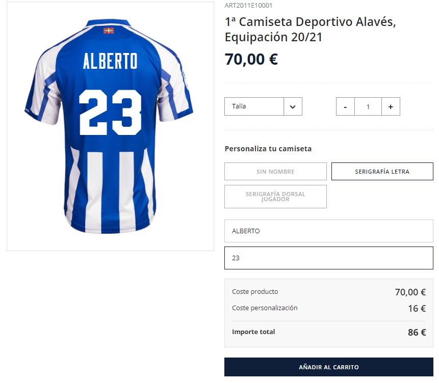 Camiseta del Alavés, cuesta 70€ + 12€ si se le desea impresionar seriegrafía