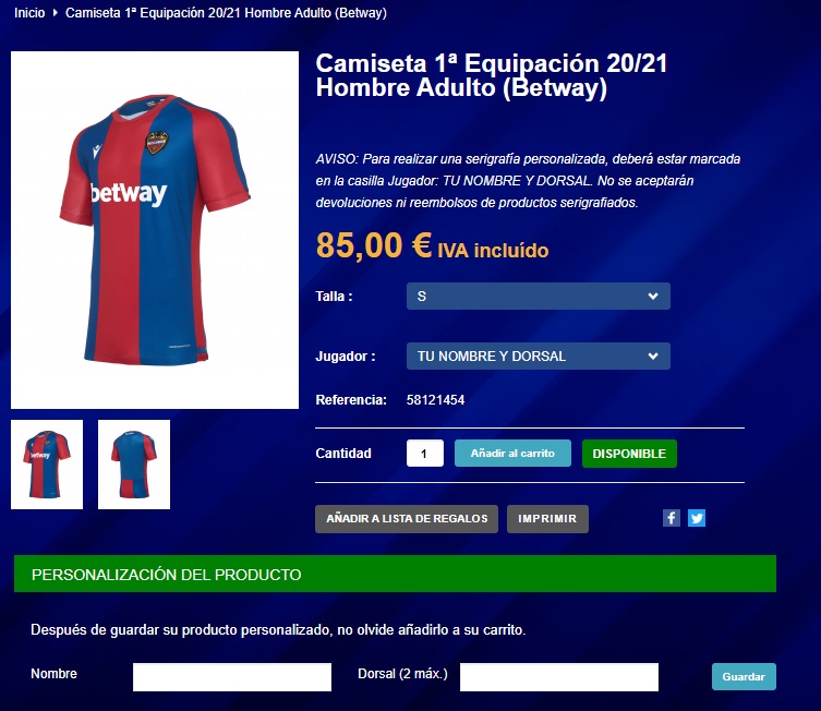 El Levante tiene puesta su camiseta en su tienda oficial online por 70€. 15 € es el coste para poder imprimir número y dorsal en la camiseta.