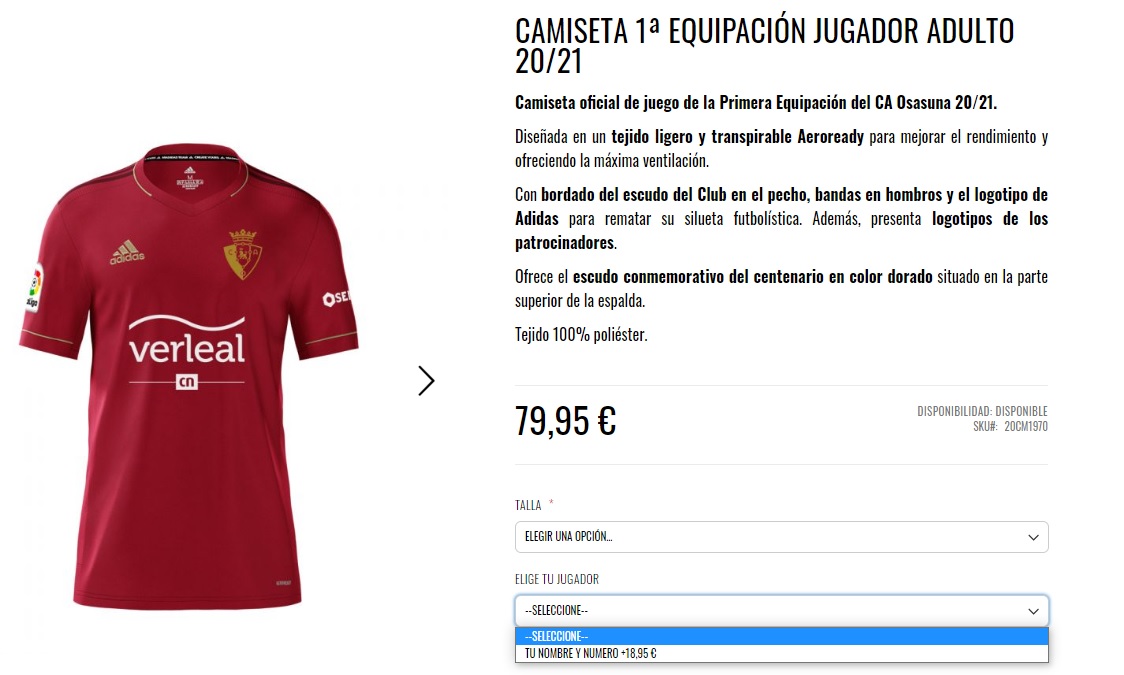 El conjunto rojillo vende su camiseta por 80 € Puede llegara llegar al coste de 100€ con seriegrafía de dorsal y número (19,95 es el precio de la impresión)