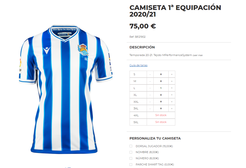La camiseta del equipo txuri-urdin cuesta 75€ Este coste cambiaría si se quiere realizar la seriegrafía de dorsal y número llegando a los 90€