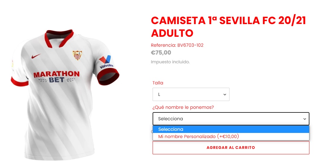 La camiseta del equipo de Nervión tiene un precio de 75€ a los que se debería de añadir 10€ más si se desea imprimir número y dorsal