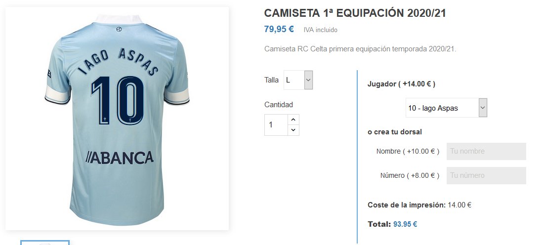 La camiseta del Real Club Celta de Vigo 80 €. 14 € son el precio que ha puesto el equipo vigués por el dorsal y el nombre en la camiseta.