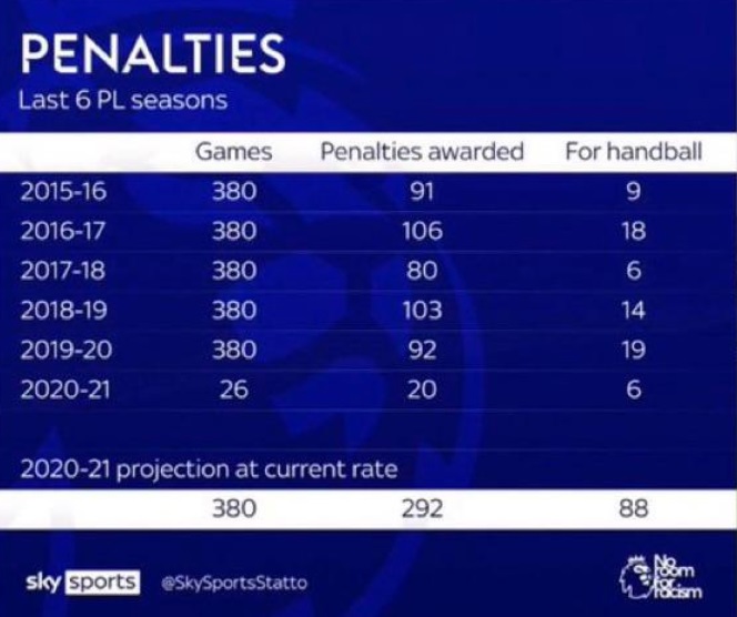 Anecdóticamente, esta temporada con la inclusión del VAR y a pesar de intentar ser, como se ha comentado, más indulgentes con las manos en el área, se han triplicado el número de penaltis en la Premier League en comparación con los últimas temporadas