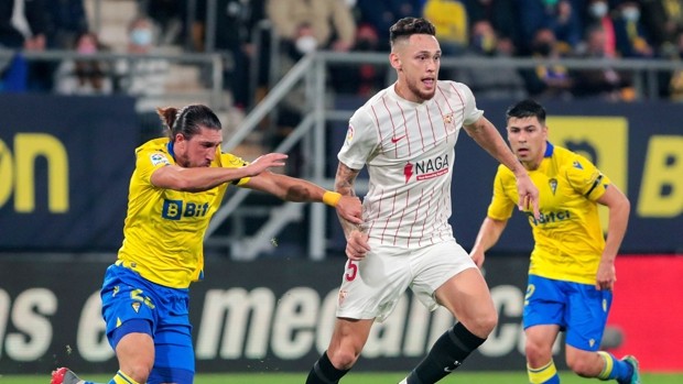 Un gol del argentino Lucas Ocampos proporcionó el triunfo en el estadio Nuevo Mirandilla ante el Cádiz al Sevilla que aprovechó el resbalón del Real Madrid para acercarse en cinco puntos, con un partido menos, al liderato que aún conserva el conjunto blanco.