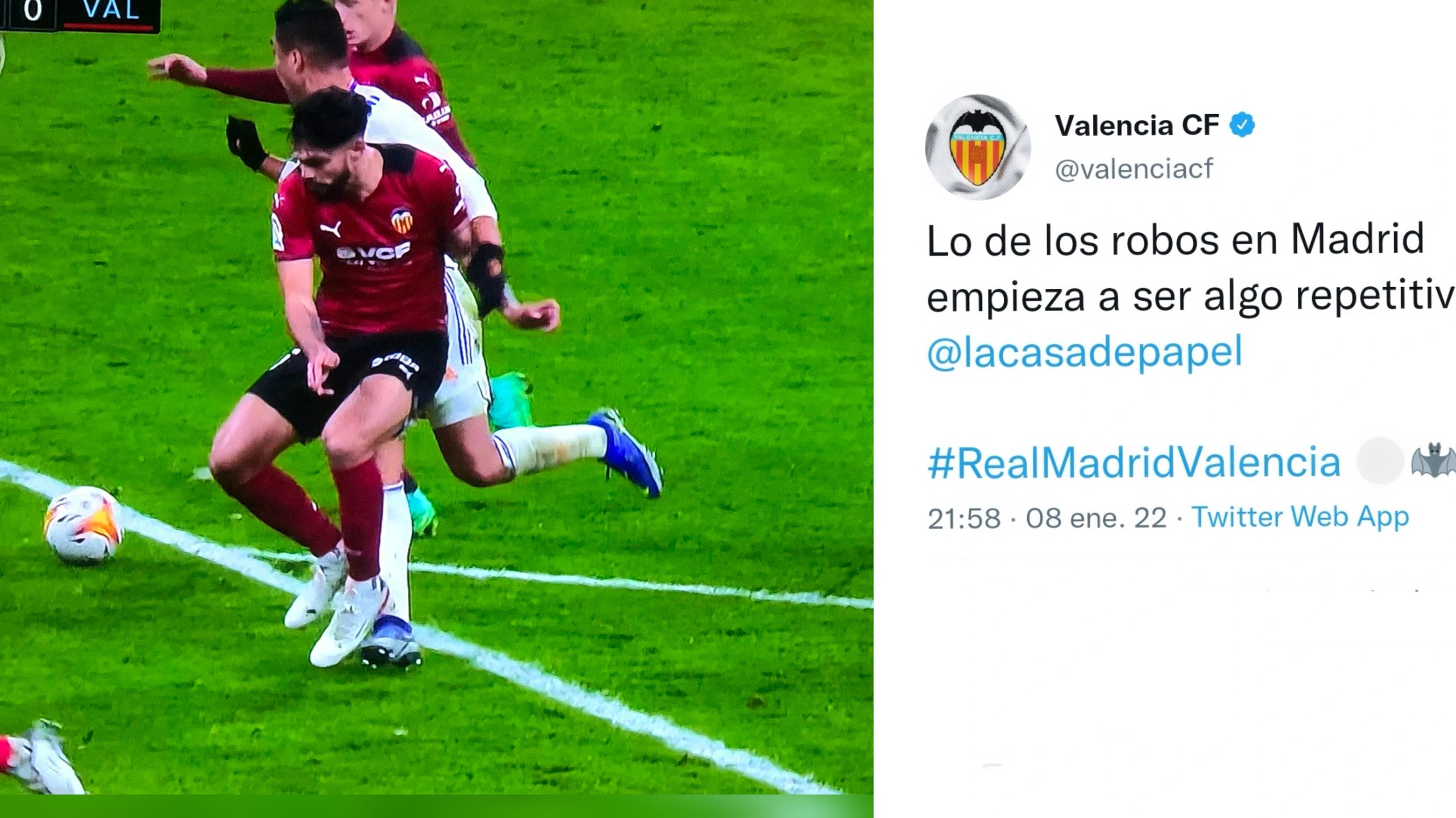 Después de que Karim Benzema convirtiese la pena máxima poniendo el balón en la escuadra de Cillessen, el Valencia en Twitter ha hecho referencia a 'La Casa de Papel' para mostrar su enfado sobre el lance que ha abierto el marcador: "Lo de los robos en Madrid empieza a ser algo repetitivo".