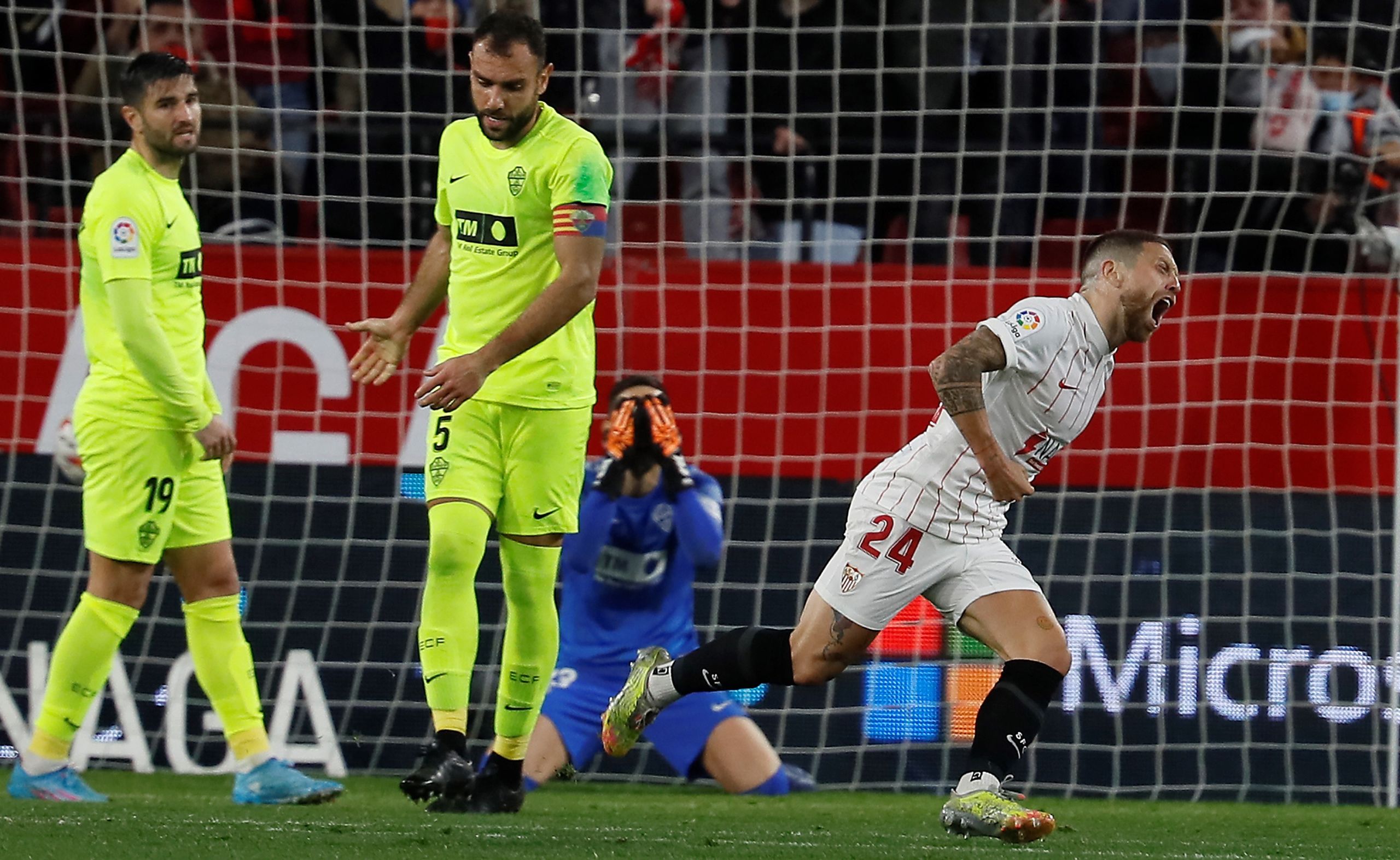La noche no fue cómoda para un Sevilla que se topó con un rival muy correoso y sólido en defensa. El Elche apenas hizo daño en el campo contrario pero sobrevivió con mucha entereza en los mejores momentos del cuadro local. En-Nesyri desperdició la primera clara ocasión del equipo nervionense a los 12 minutos y Rakitic estuvo a punto de sorprender a Badía desde fuera del área en el ecuador del primer tiempo.