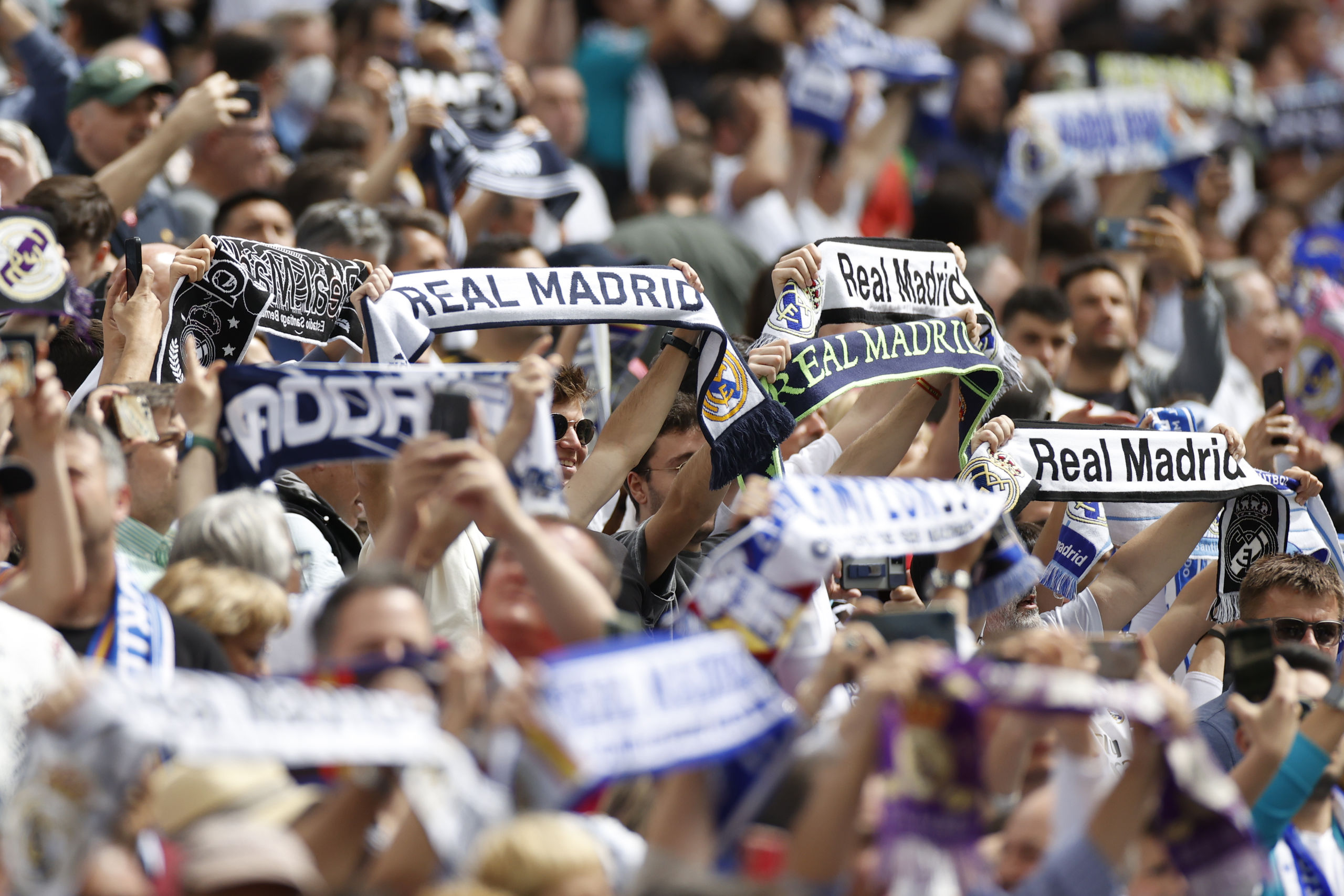 Aficionados madridistas animan a su equipo con las bufandas del club. En el estadio Santiago Bernabéu hubo esta tarde 58.686 espectadores.