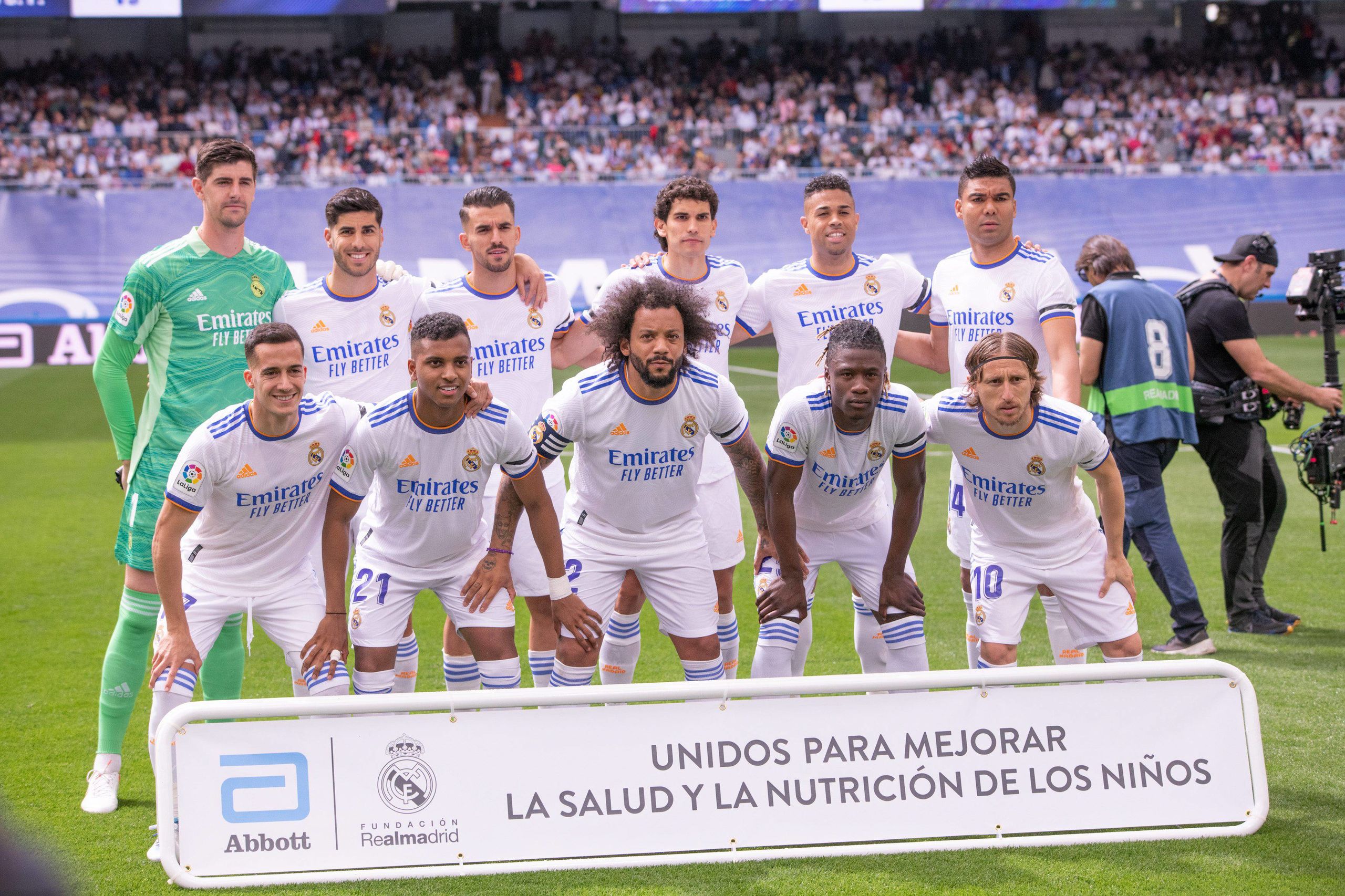 El once del Real Madrid ante el Espanyol. De izquierda a derecha y de arriba a abajo: Courtois, Asensio, Ceballos, Vallejo, Mariano, Casemiro; Lucas Vázquez, Rodrygo, Marcelo (capitán), Camavinga y Modric.