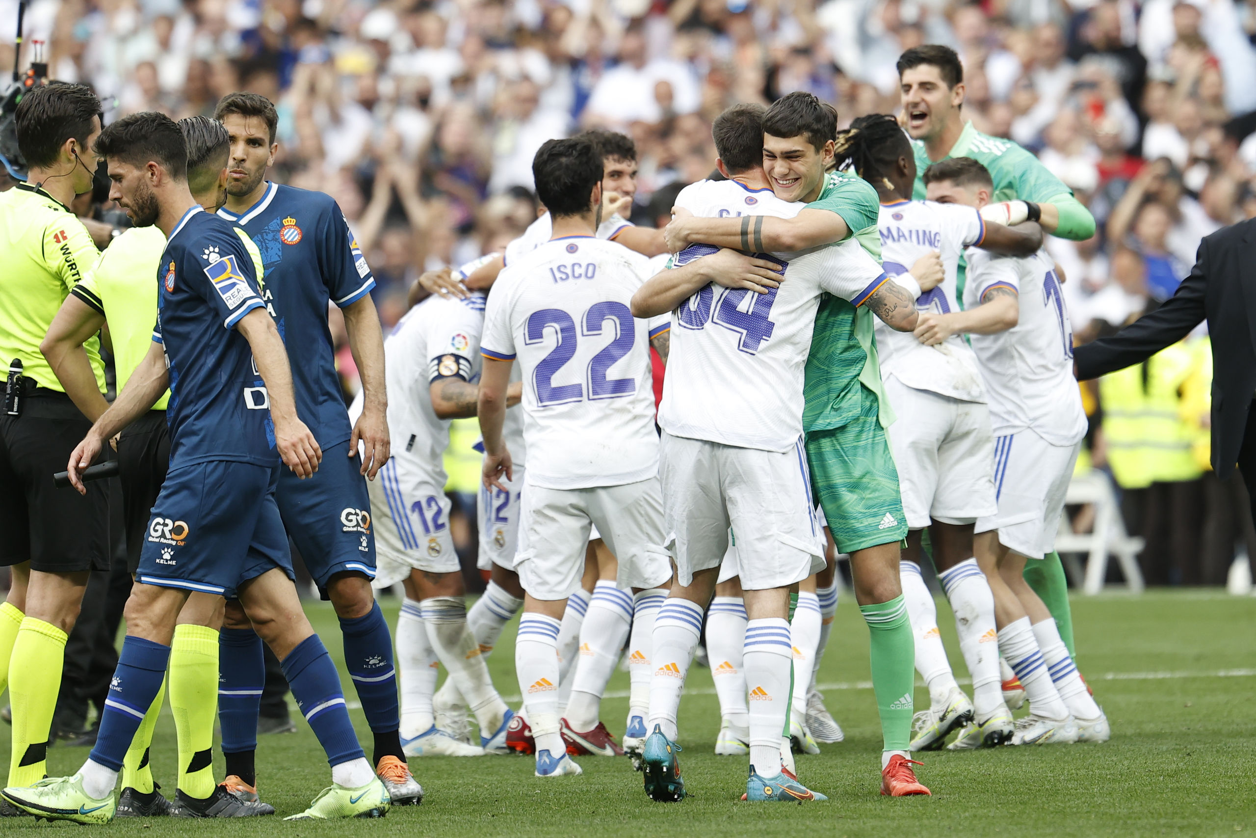 Selección de las mejores imágenes de la victoria del Real Madrid frente al Espanyol en el Santiago Bernabéu (4-0), que permite a los blancos conquistar su trigésimo quinto título de Liga.