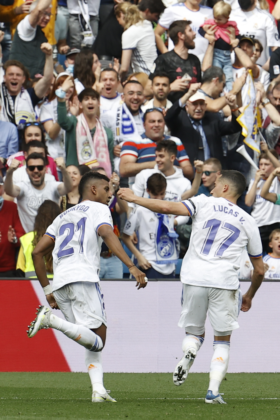 Rodrygo fue el encargado de abrir el marcador ante el Espanyol en el Bernabéu. En la imagen, el brasileño se funde en un abrazo con su compatriota Marcelo.