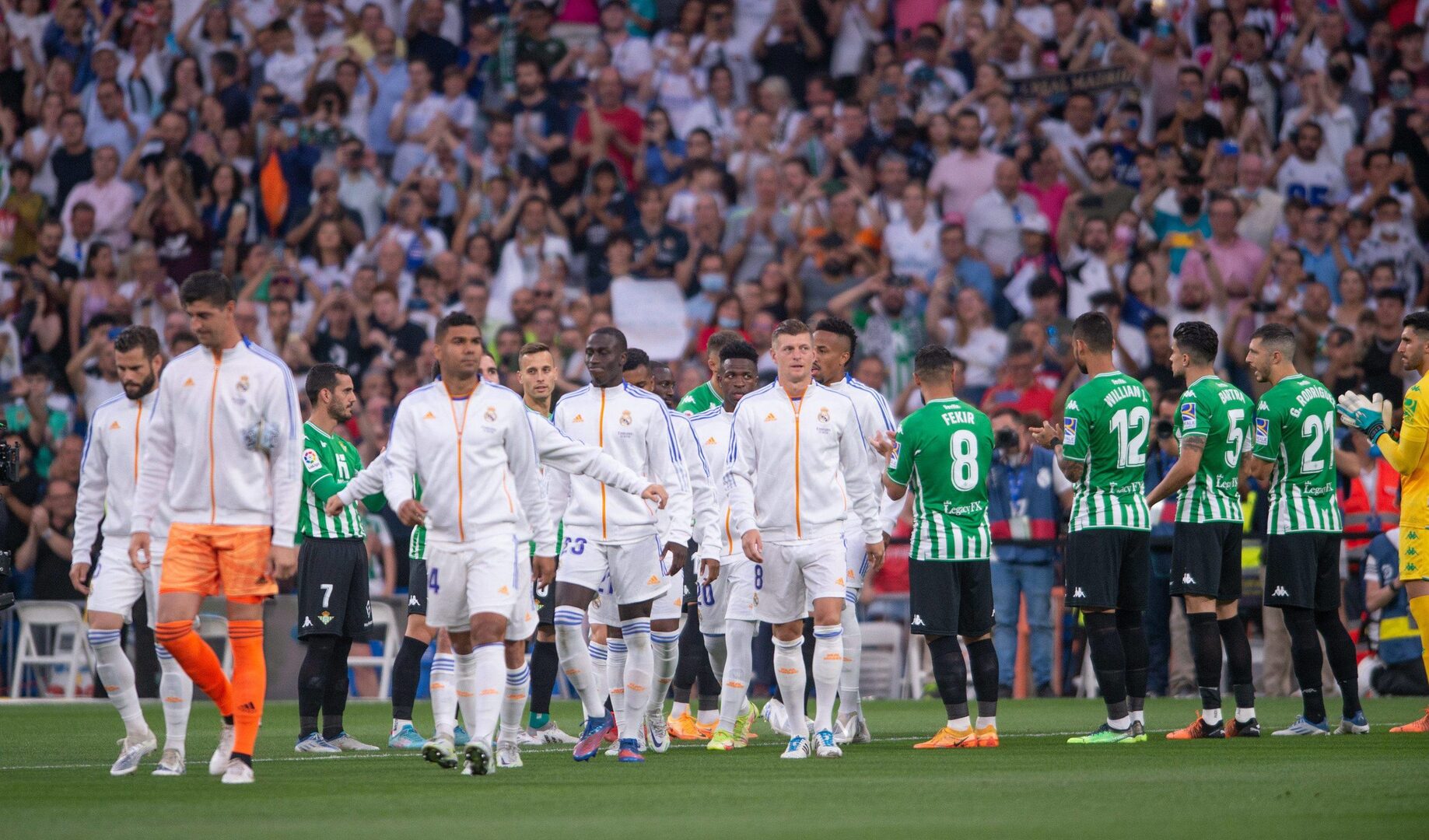 Los futbolistas de Real Madrid y del Betis saltaron al terreno de juego del Santiago Bernabéu aplaudidos por sus rivales en forma de pasillo, primero el conjunto local y más tarde el visitante, como reconocimiento a los títulos de Liga y de Copa del Rey que han logrado, respectivamente, esta temporada.