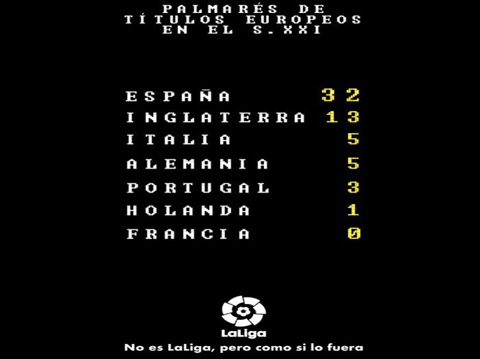 Con el eslogan ‘No es LaLiga, pero como si lo fuera’, LaLiga ha lanzado una campaña en diferentes medios de comunicación y en las marquesinas de algunas ciudades españoles que reconoce el éxito de los clubes españoles en las competiciones europeas y con la que tratan de remarcar que no hay una competición igual en el viejo continente tan competitiva como LaLiga.