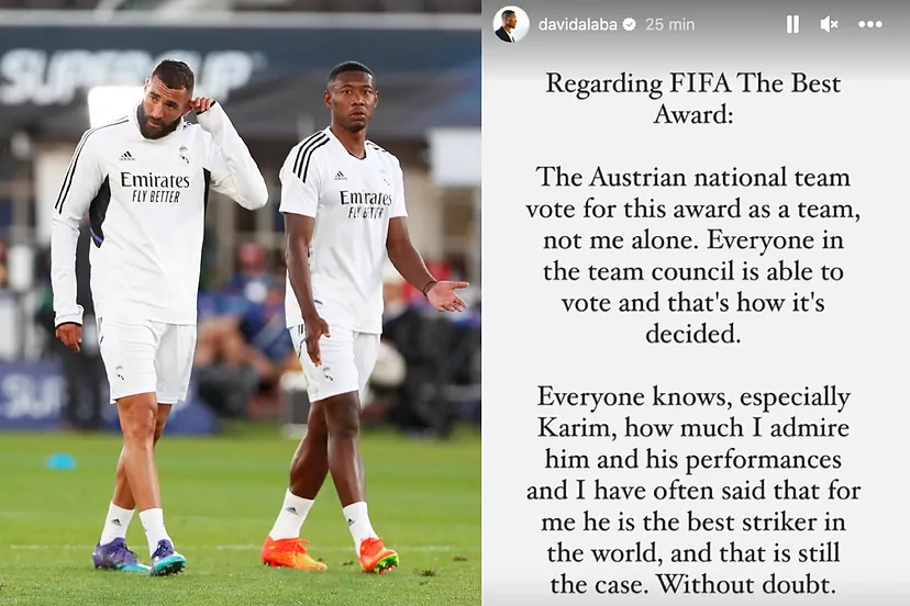 "A raíz de los Premios FIFA The Best. La Selección de Austria escogimos los votos de este galardón como equipo, no sólo yo. Cualquiera en la plantilla está habilitado para votar y así es como procedimos. Todo el mundo sabe, y especialmente Karim (Benzema), cuánto admiro a él y sus actuaciones. Y ya he dicho en varias ocasiones que para mí es el mejor delantero del mundo; que todavía lo es. Sin lugar a dudas", ha afirmado Alaba para tratar de explicar el por qué de sus votos en el 'The Best'.