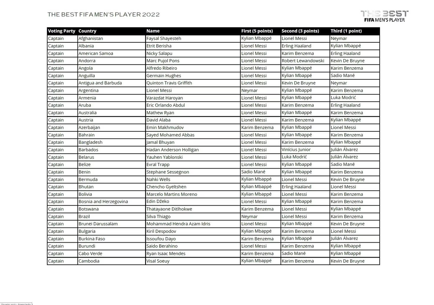 Se otorga 5 puntos al más votado, 3 al segundo y 1 al tercero. A Alaba le tocó votar como capitán de Austria, pero en vez de ser un voto individual en su selección apostaron por hacer una votación general de todo el equipo internacional austriaco. Salió Messi y Alaba le concedió su voto.