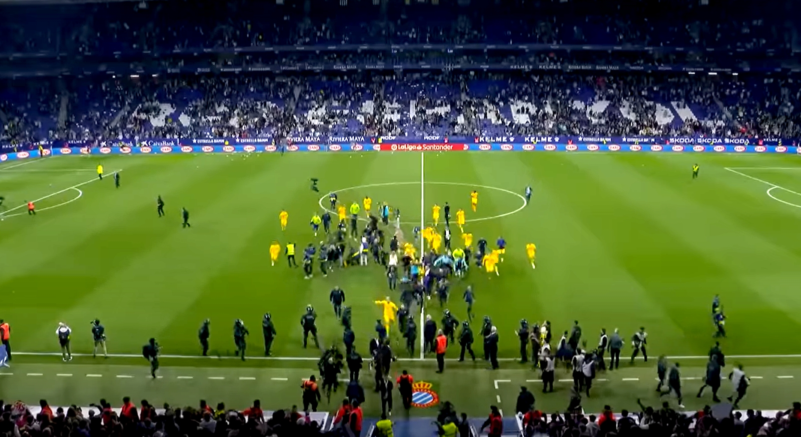 Hasta que ultras blanquiazules empezaron a saltar al campo y se inició una lluvia de objetos que obligó a intervenir a los Mossos d'Esquadra y a la seguridad privada del estadio para garantizar que los jugadores del Barça pudieran ganar el túnel de vestuarios.