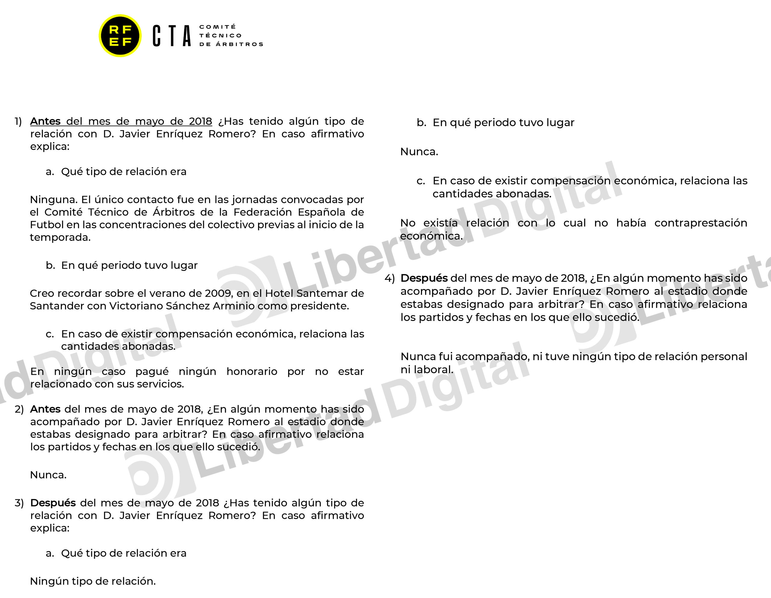 4) Después del mes de mayo de 2018, ¿En algún momento has sido acompañado por D. Javier Enríquez Romero al estadio donde estabas designado para arbitrar? En caso afirmativo relaciona los partidos y fechas en los que ello sucedió. Nunca fui acompañado, ni tuve ningún tipo de relación personal ni laboral.