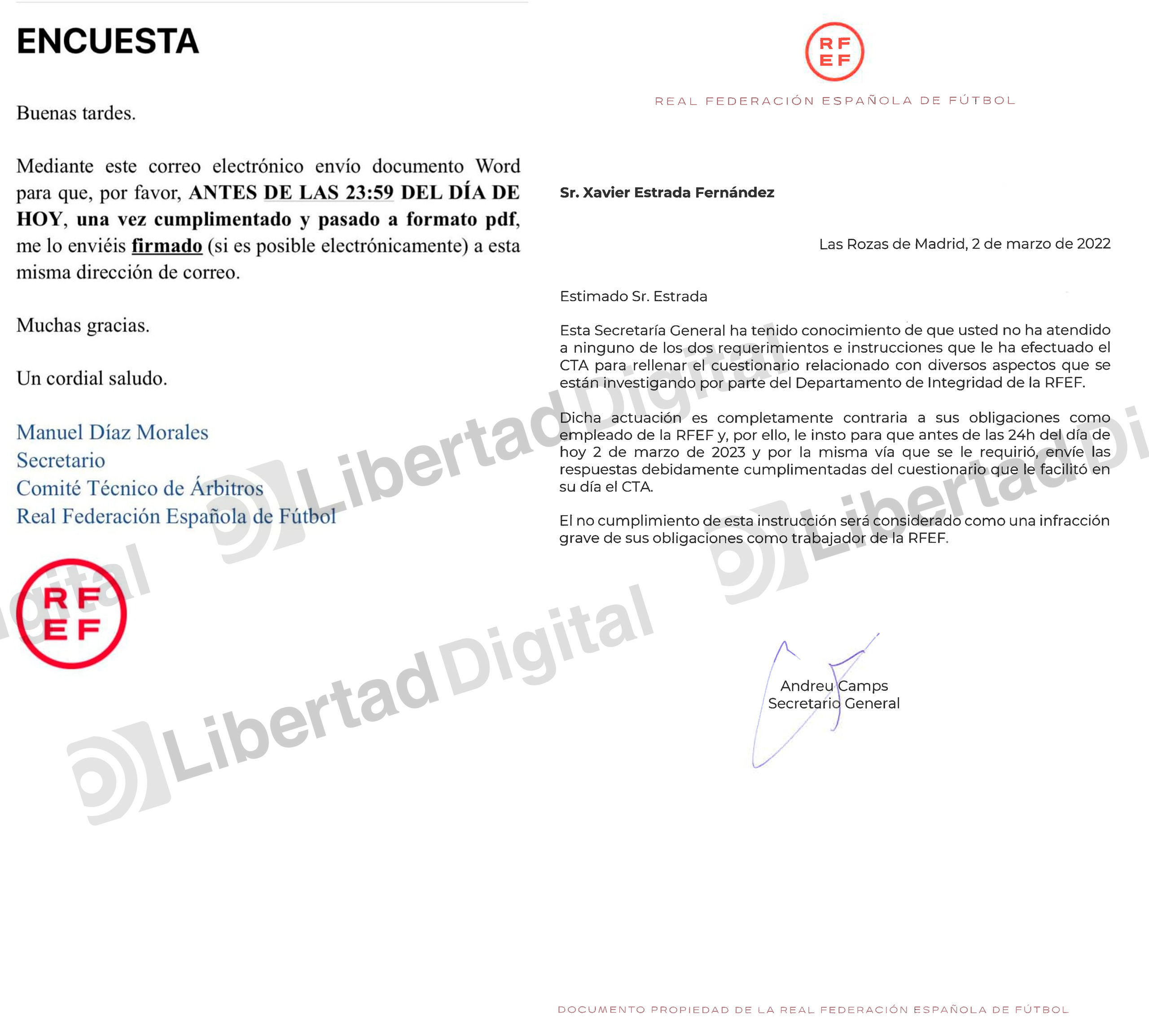 Tras recibir una advertencia vía telefónica, el secretario general de la RFEF y nº 2 de Luis Rubiales, Andreu Camps, remite a Estrada Fernández una carta que publica LD en la que se le amenaza con abrirle un expediente si no contesta de inmediato la "encuesta":